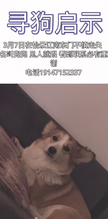 小狗丢失于怡景将南 3月七日上午11点在小区门口走丢 如果遇见此小狗 请立即与我联系 必有重谢!